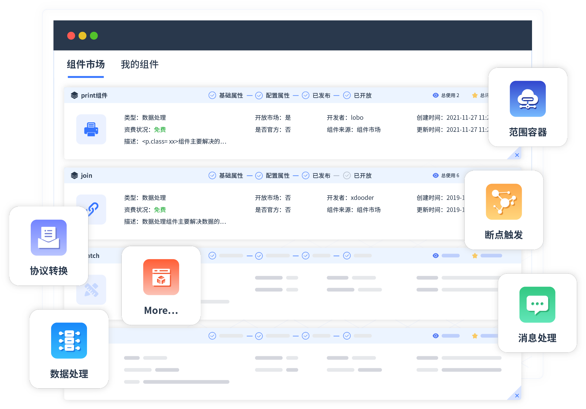 针对集成场景,,CGPAY钱包提供组件市场,,例如协议转换、、、、消息处理、、、、文件操作等。。。除平台提供的组件外,,,客户可以自定义所需组件。。
