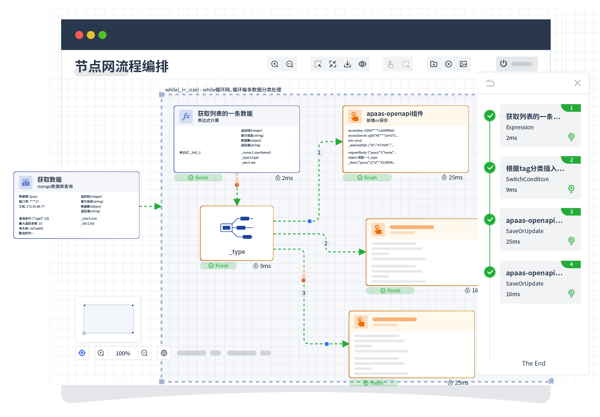 针对集成场景,,组件定义后支持进行流程编制,,,不同于传统代码方式,,,,通过图形化展示,,,,支持在线调试、、、、日志查看和运行回放。。。